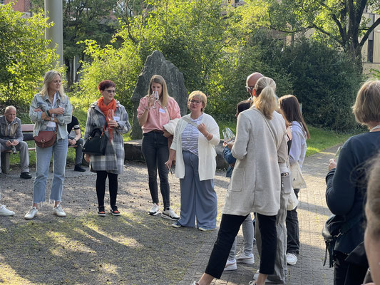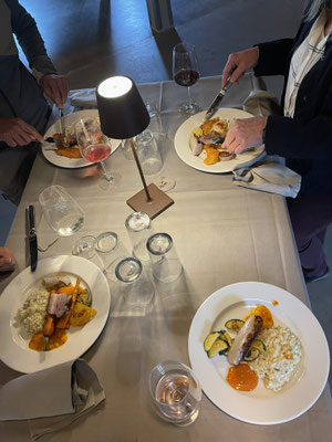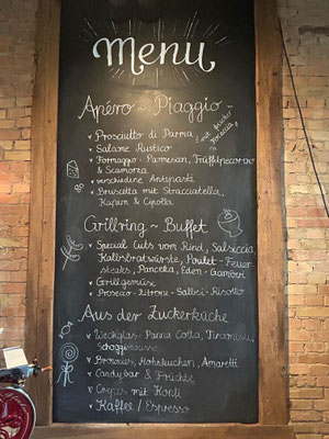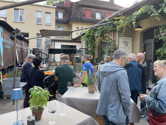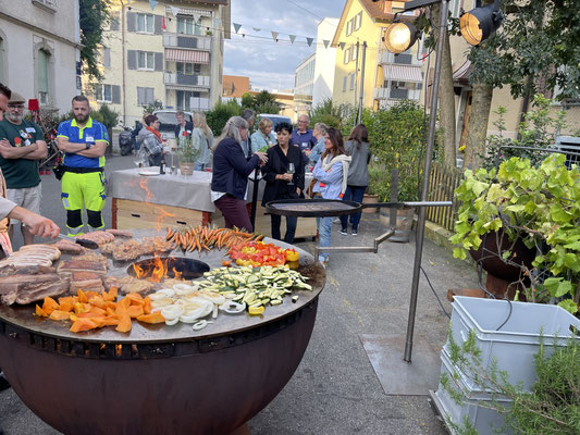Nach einer kurzen und herzlichen Begrüssung durch die Präsidentin und anschliessendem kurzen Spaziergang lüftete sich das Geheimnis: Unsere Feier führte uns in die einladende Festküche, den Eventräumlichkeiten der Focacceria St. Gallen. Dort erwartete uns ein kulinarisches Fest: herzhafter Apéro in ungezwungener Atmosphäre und bei bestem Wetter vor den Lokalitäten, zart gegrillte Spezialitäten von der Feuerschale, garniert mit einem feinen Risotto in den Räumlichkeiten der Festküche und später ein vielseitiges Dessertbuffet, das keine Wünsche offenliess. Begleitet wurden wir dabei von einem äusserst aufmerksamen Serviceteam – allen voran unserem „Oberkellner“, der schnell durch seinen besonderen Charme, seinen Schalk und seinen französischen Akzent zum Mittelpunkt des Abends wurde.